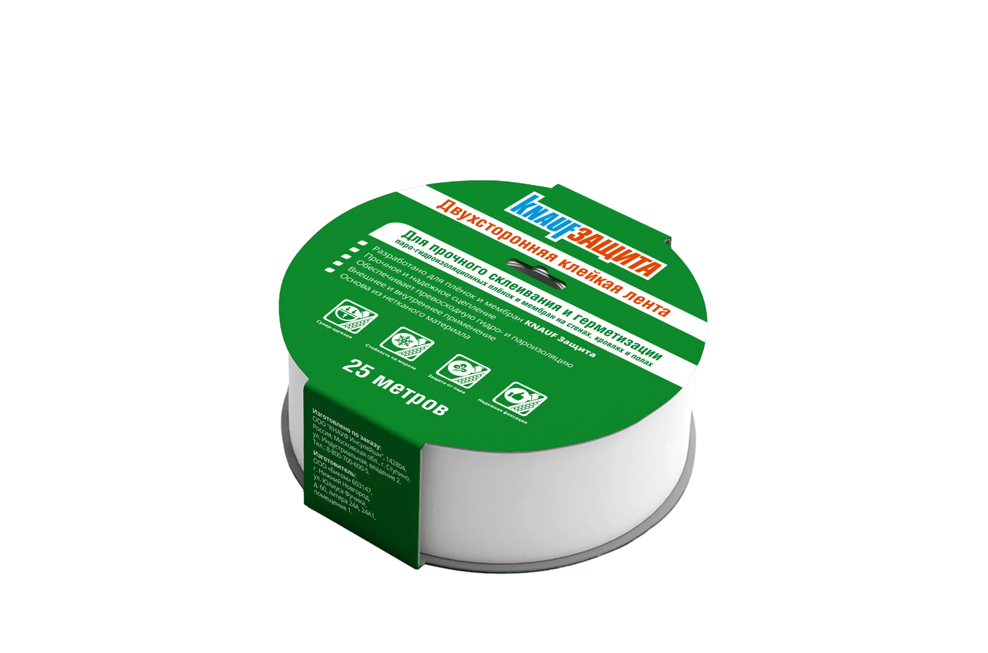 Двусторонняя клейкая лента KNAUF Защита надежно склеивает стыки ветрозащитных, влагозащитных, гидроизоляционных и пароизоляционных материалов КНАУФ Защита. Лента превосходно защищает от влаги и пара. Может применяться для уплотнения кровельных проходок и ремонта повреждений.